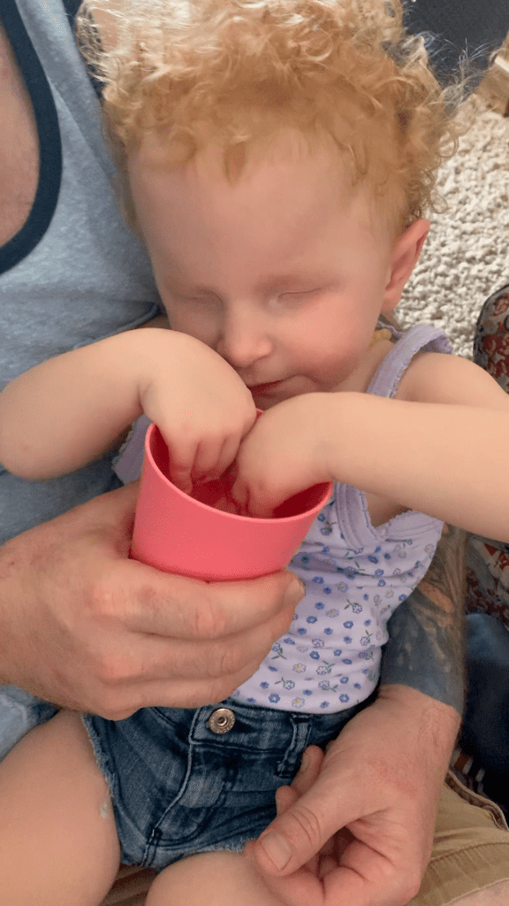 Eleanor can take bottles & sippy cups with soft tops. So far, we’ve been unsuccessful in getting her to take regular sippy cups with hard tops. So we figured we’d try to go straight to a cup! Eleanor did really well, enjoyed feeling the cup & water, & even got a few good sips in! 💧