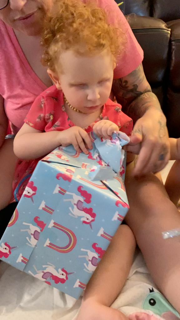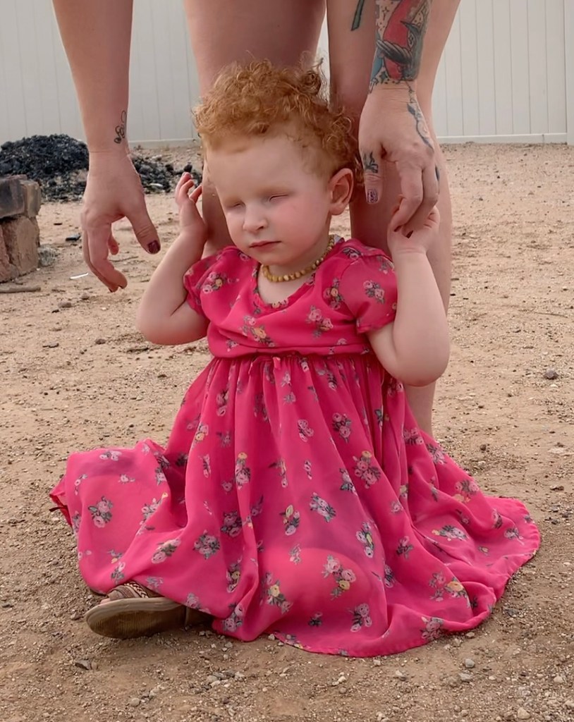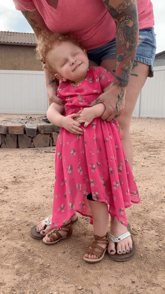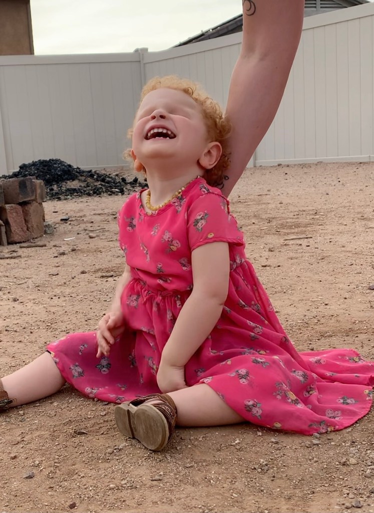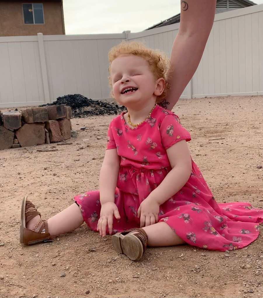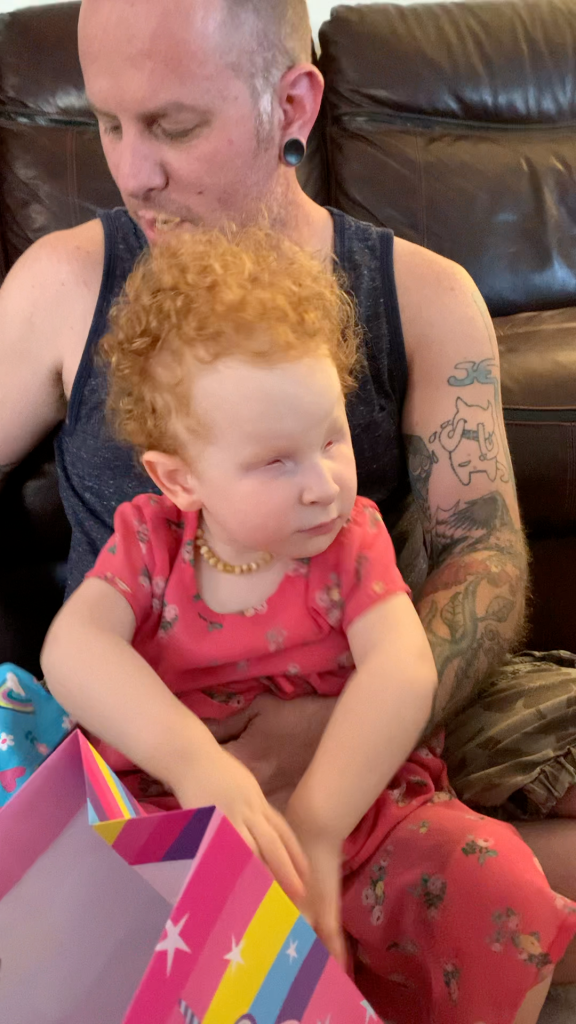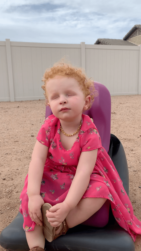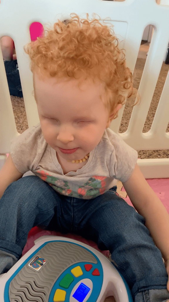 We tried something new! Playing catch! You can imagine it’s a hard concept when you can’t SEE what’s going on! She did so well for her first real time playing catch since she was a baby! She got the concept of PUSHING it at least! She even signed “ball” when she wanted her dad to send it back! She does tend to throw herself around wrecklessly…especially when she’s excited. 🤩 She really got her whole bod in there when it came time to send the ball back. 😆
